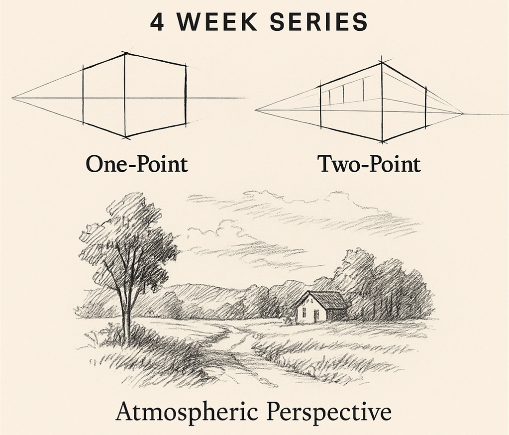 October 6,13,20,27 (make up classes available on Thursday mornings) Learn how to bring depth and dimension to your drawings with this four-session class focused on perspective. We'll cover one-point, two-point, and atmospheric perspective. Beginners welcome!